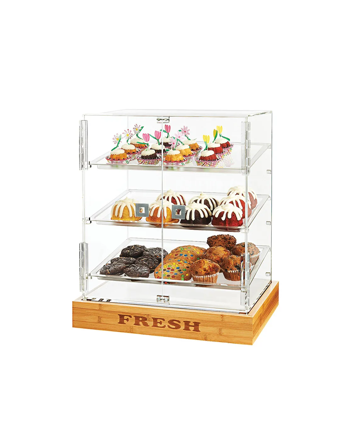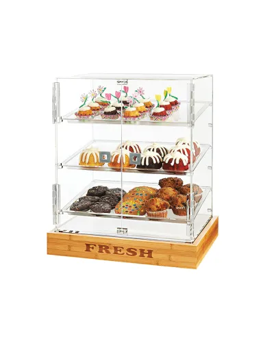 Rosseto Vitrina Expositora de Pasteles con Dos Puertas y Tres Trays Frosted sobre Base de Bambú